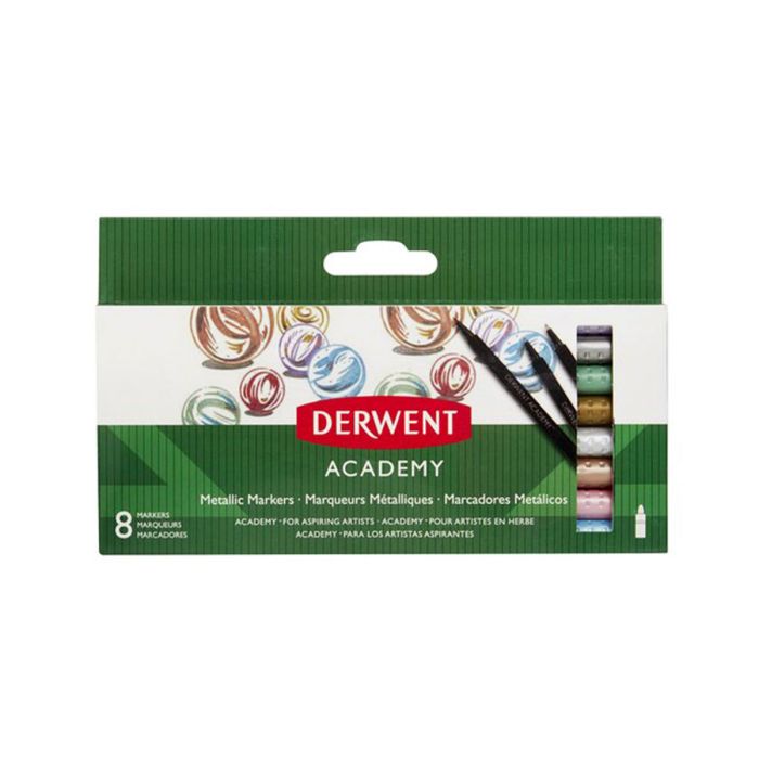Derwent Academy Metallic Markers-tusseilla saat tarkkaa ja yksityiskohtaista jälkeä. Kauniit metallinhohtoiset värit toimivat erityisen hyvin mustalla kartongilla! Pahvirasiassa on 8 tussia, sävyt copper, graphite, lilac, green, silver, gold, blue ja pink.
