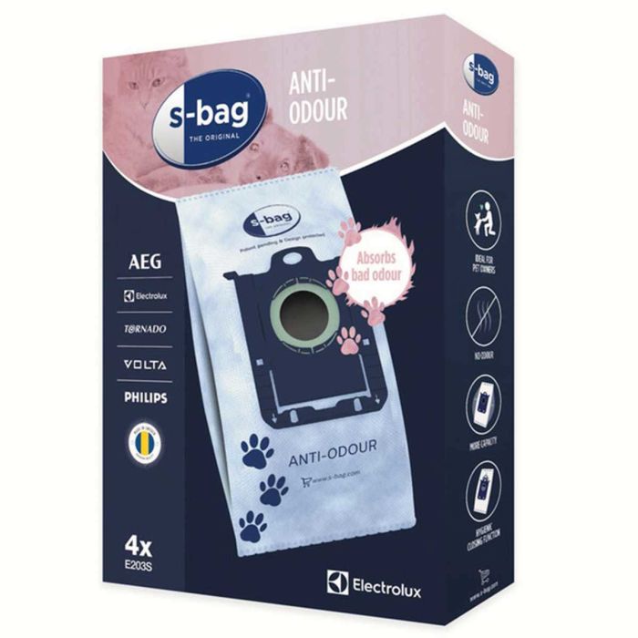 Electroluxin S-Bag Anti-Odour pölypussi soveltuu mainiosti esimerkiksi lemmikkieläinten omistajille. Neutraloi hajuja. Sisältää neljä pussia.
