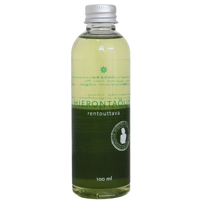 Rentouttava hierontaöljy 100 ml sisältää rypsiöljyä ja aitoja 100% eteerisiä öljyjä: lavandiini, appelsiini, sitruuna ja laventeli. Laventelin tuoksu tasapainottaa mieltä ja lisää univalmiutta. Hieronta rentouttaa ja laukaisee lihasjännityksiä sekä tuo hyvää oloa.