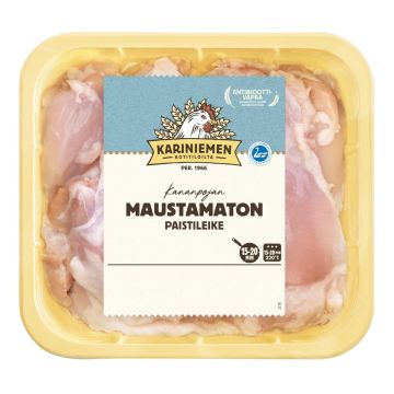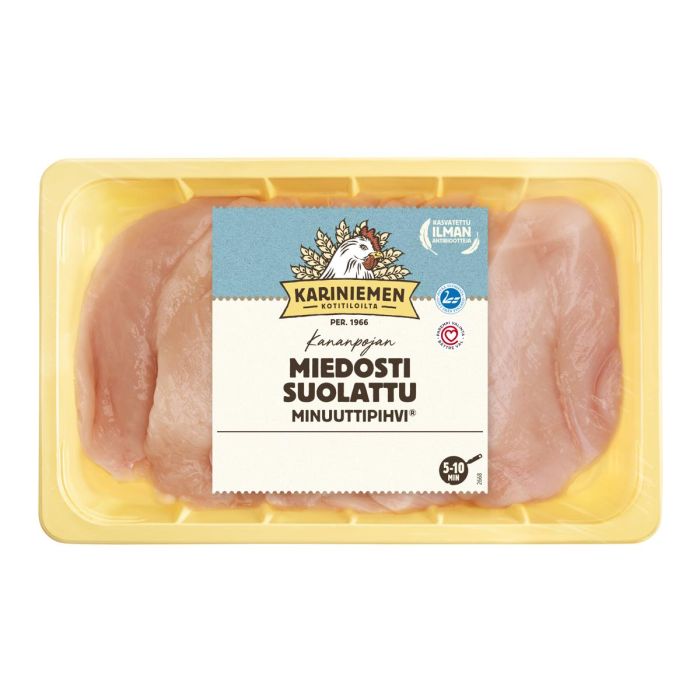 Kariniemen Kananpojan Minuuttipihvi miedosti suolattu on ohut, fileestä valmistettu pihvi. Mieto suolaus pitää pihvit kypsennettäessä mehevämpänä. Minuuttipihvi sopii moniin kanaruokiin, esimerkiksi pasta-annoksiin, salaatteihin ja on herkullinen myös grillattuna. Rasiassa on 6-8 pihviä. Kariniemen Kananpoika on aina suomalaista, ilman antibiootteja kasvatettua kanaa.