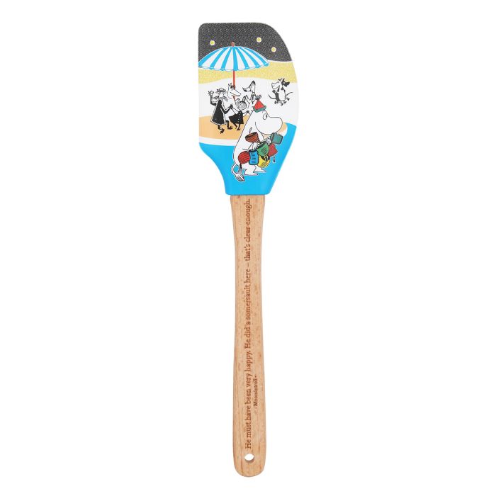 Silikoninen nuolija, jonka varsi on FSC-sertifioitua puuta. Silikonisen nuolijan kuvituksessa kuvituksessa Muumipeikko ystävineen valmistautuu sadonkorjuujuhlaan. Käsinpesu.