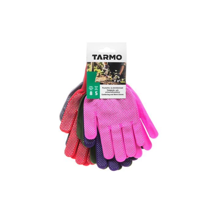 Ohuet polyesterikäsineet joiden kämmenpuolella pitoa parantavat PVC-näppylät. EN 420 standardin vaatimusten mukaiset.