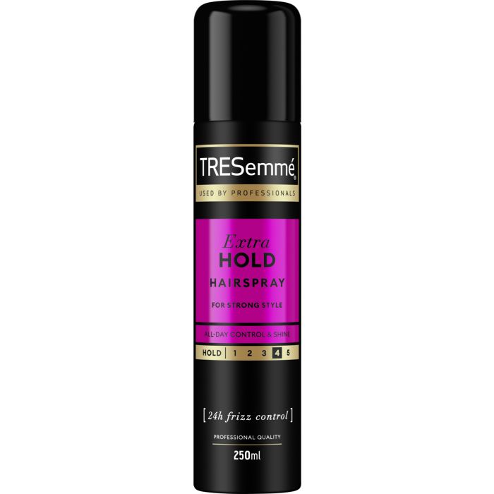 TRESemmé Extra Hold hiuskiinteen avulla viimeistelet kampauksesi kuin ammattilainen. TRESemmé Extra Hold tarjoaa salonkitason viimeistelyä hiuksillesi kätevässä 100 ml matkapakkauskoossa. Extra Hold on hiuskiinne, joka kuivuu nopeasti ja antaa kampauksellesi pitoa, joka kestää joka kahden vuorokauden ajan. Tämä hiuslakka pitää lentelevät irtohiukset kurissa ja varmistaa parhaan mahdollisen, mutta kuitenkin joustavan pidon. Nauti helposti hallittavasta kampauksesta, joka pysyy upeana joka säässä, sillä hiuskiinne suojaa kampaustasi myös kosteudelta.